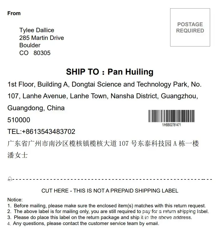 They sent me the return label (see attached), I printed it, I packaged the dresses securely and attached the return label, then mailed it to China at my cost ($27.75) on August 7, 2021.