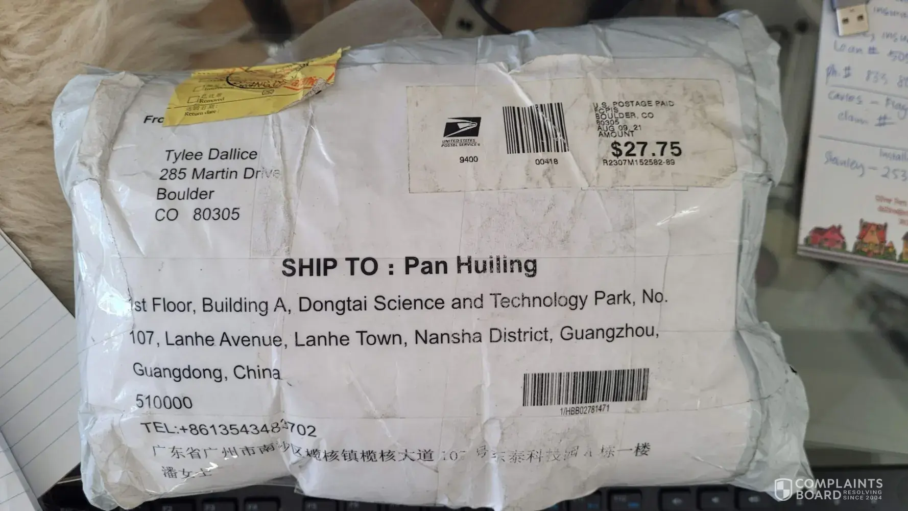 Today (01/29/2022) the package was delivered back to my house as undeliverable in China. See picture attached.