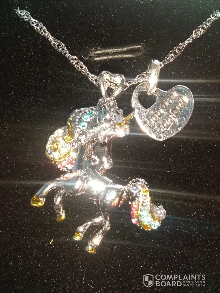 Ordered necklace for my granddaughter. I recently received the necklace and am very disappointed. It was supposed to be 2 sided. The unicorn is only one sided and it was supposed to be 3 dimensional. The heart charm is only one sided. It says you are magical in one side and is supposed to say I love you on the other side and it does not. No invoice was included. There's only a po box number on package. No phone number and no way to contact the company.