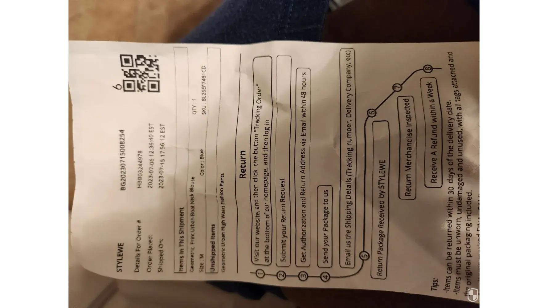 I ordered 3 dresses, 2 finally arrived nearly 6 weeks later. The other item I cancelled due to slow delivery, was supposedly given a refund. The 2 dresses I received are of poor quality and cheaply made material. I've tried several times requesting the return label but they will not send it to me. I want to return this mess and get my refund! DO NOT ORDER FROM STYLEWE!