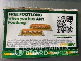 I received a sheet of Subway coupons in the mail and have used several of them on the sheet at this Subway location. Yesterday I ordered two footlong sandwhiches and presented the "Free Footlong when you buy ANY Footlong" coupon. The person who made the sandwich told the cashier that they didn't take the "Buy one get one free" coupon. I told him that I had...