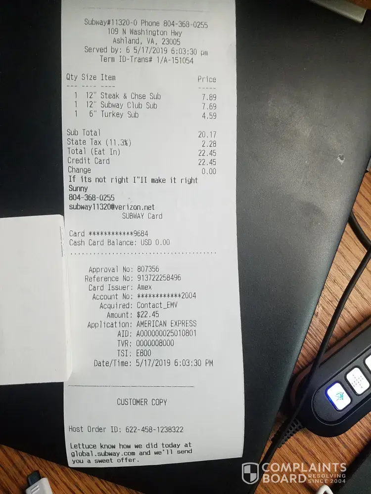 Also, when I attempted to send a message to the address listed on the receipt "global.subway.com" it didn't work, it should be "global@subway.com". As a corporate franchise do you support your customers and franchise members effectively?