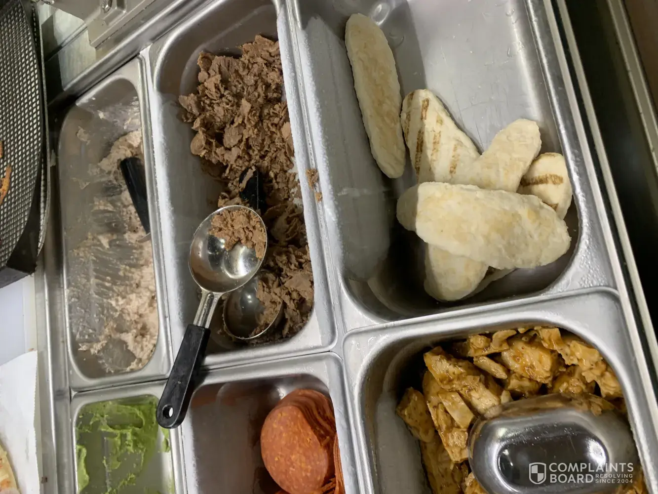 Hello, this is what I found in the Tuna and steak bins at the Subway restaurant inside Walmart Super Center in New Roads Louisiana on 6/2/2019. I can understand dropping the serving utensil Inside the bin by accident, but to leave it there and get ANOTHER utensil and just go around the dripped ones is just down right lazy and unsanitary. I included pictures.