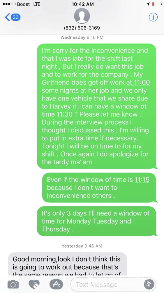 I'm not sure How do I get in contact with a owner of a subway that is franchised, 21183 Kuykehndahl Rd Spring Tx 77379, I lost my car due to Hurricane Harvey and my boyfriend was hired on as a worker . Showed up to every shift on time and the one time he made it 15 minutes late to pick me up from work which he already discussed with the hiring manager at the Subway location prior to being hired on in the interview process that we share a vehicle, well she texted him to terminate him & removed him completely off the schedule without notice when he went to work his overnight shift because he showed up late one time . It's unprofessional and something that should be addressed by the owners franchised or not, I want to know if this is how Subways operates with their business? I left my job early to get him to work and he go in and they tell him she took him off the schedule. She texted trying to get him to quit and it is like one way or the other she wanted to force him out the door probably because she is a manager having relations with a employee and he knew about it .