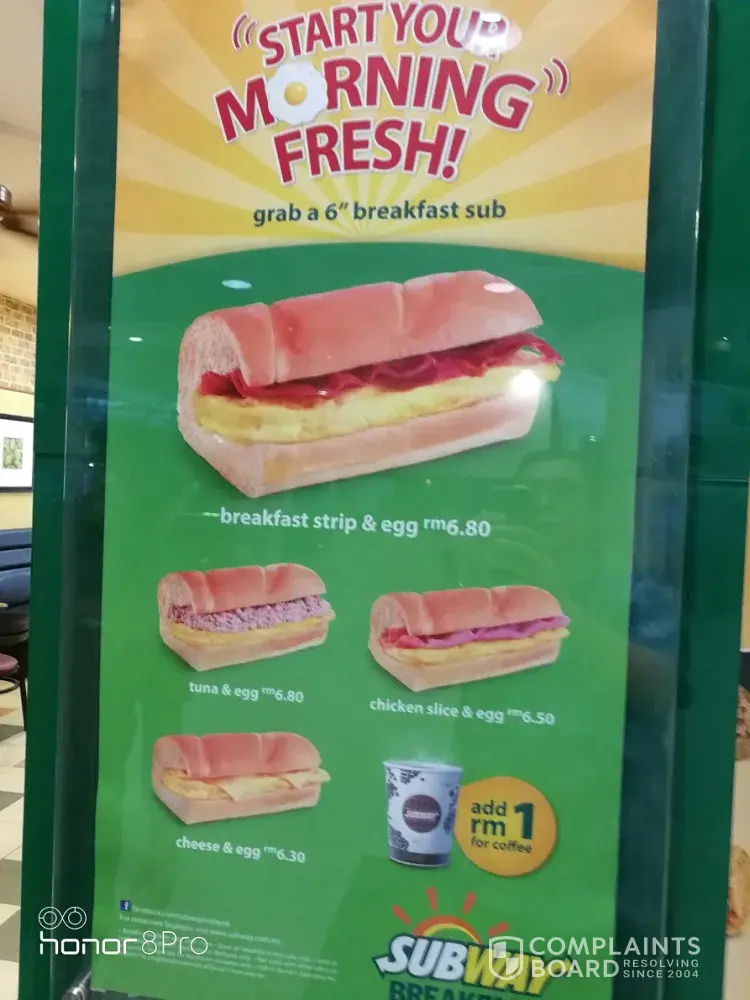I had the worst experience at Subway today at South City KL in Malaysia at 10am when I went there to buy my breakfast strip set with eggs. The big ad at the front says it is only RM6.80 but when I ordered it to pay, I was charged RM7.30 and the attendant says the big ad was wrong and old already. But when i told them then why not remove the ad because customer will only pay according to the price in the ad and not according to their whims and fancies. They called me problematic and the supervisor Laksa even challenged me to report them to their bosses if I can get the contact. Is this how Subway operates? Luring customer in with low prices and charging them higher when they pay. See the ad I took the pic on. Am I wrong as a customer to buy base on the price I see on this big ad at the store front?