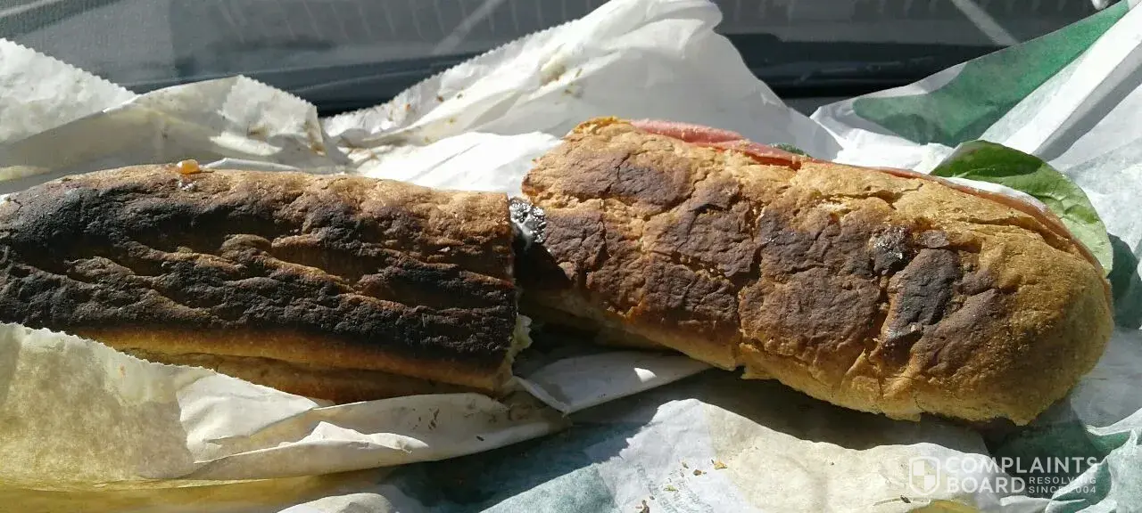 It was not until i got to my work office that I saw that my sandwhich was way burned from sitting in their toaster oven way way to long. I have a picture-and would love to send it- there was not an option to upload image, but would love to send it.