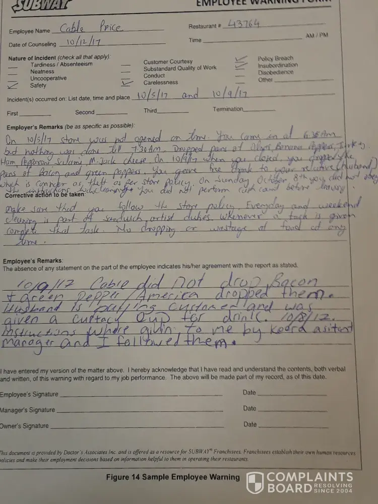 I just got fired from subway for asking for more hours. I was hired full time and only receiving 19.5 hours. I asked my store owner who is also the manager why I wasn't getting the hours I was promised upon my hiring date. She replied with taking me into the office and writing me up for things another employee had done and told me to sign it. I told her I wasn't going to sign it cause those actions that we're performed wasn't my doing and it's on camera that it was done by the other employee. She fired me for not signing it. I was discriminated against by my store owner/manager. She has called me name's on more than one occasion. She even told me to take off my work shirt before I left which would've had me topless. She can not keep employees at her store because of the way she treats them, even the customers are complaining about her. The store # 4376-0 the store address is 268 Lowes Blvd Lexington North Carolina 27292.