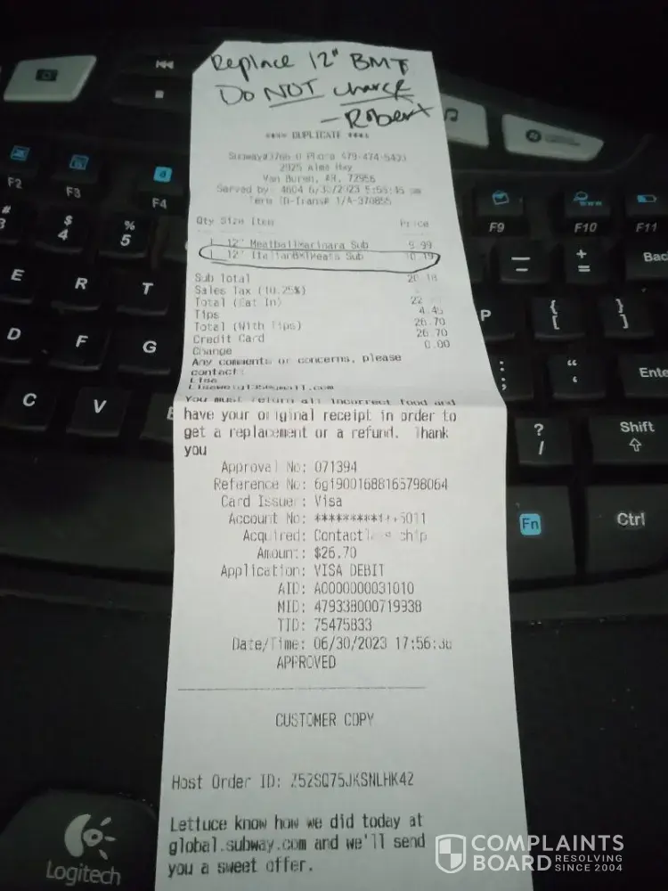 On 6/30/2023 Host code ID# 252SQ75JKSNLHK42 I have been trying to send a copy of my replacement duplicate receipt to you. But all I am getting is a auto email. I have sent several emails and still only auto email. I went to subway Van Buren 2925 Alma Hwy and purchase a BMT 12" I eat it at the restraint and the white bread was very hard knowing that it was thay was going to make another one but had no white bread done yet. I live out of town and so thay wrote on my receipt REPLACE 12" BMT DO NOT CHARGE ROBERT. I was happy customer for that. I was in Van Buren 7/11/2023 and tried to get my BMT the manager was very rude and hateful. She had to call someone and then told me that thay could not replace it because it was over 3 day's. I explained thay I live out of town and she would not listen to anything I had to say. I am very unhappy and will not to go there again but will go to another subway. I was even going to purchase some cookies but u instead just left. I would still like my BMT sub replaced.