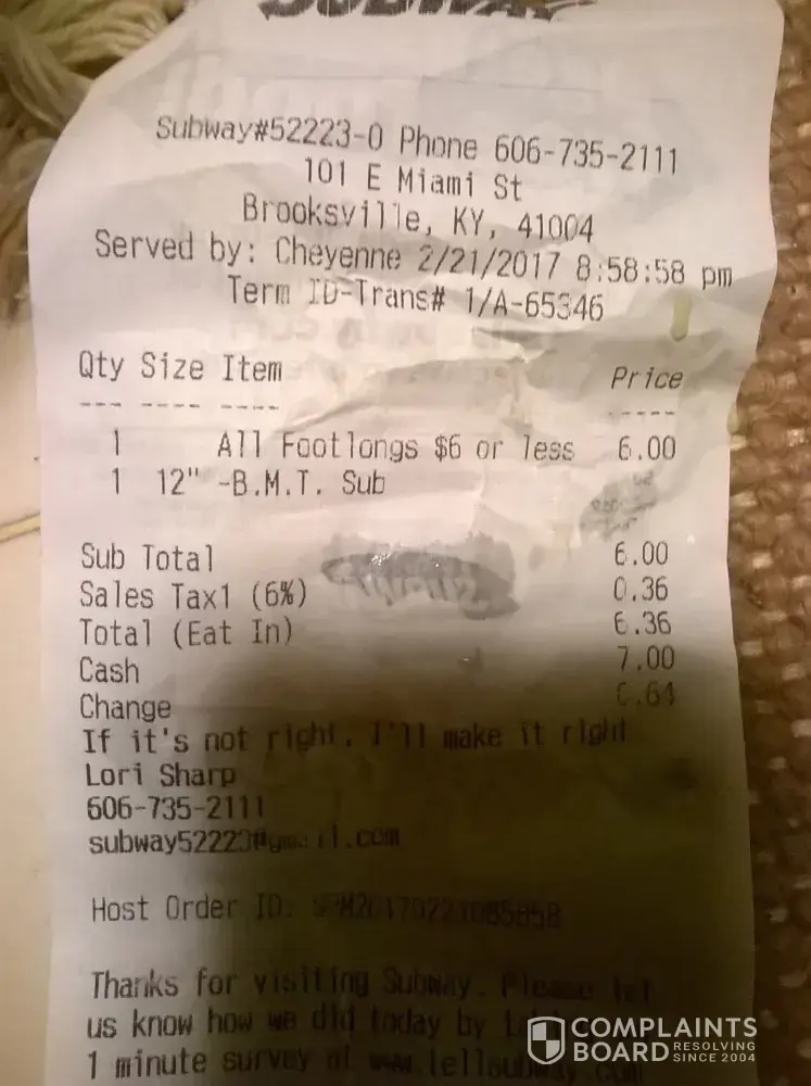 Store 1118 Columbus St. Ottawa IL. Order Number SPM20170426125036. Saw ad for the $5.00 ft long spicy sub. I had to ask about it because it wasn't on the menu. No where did it say what was on it. It looked good. When I saw them making it I asked for a couple of slices of Hot Capicola. No where did it say on the menu that 3 slices of meat would be and extra $3.00 and the girl never said a word. ( I can get a lb at the store for that price) The veggies I asked for were so stingy that I cut the sandwich in half and put them all on one side. So my husband and I each got a 3" sub for lunch. This is the 2nd time we've been to this Subway. The Other one on North Columbus is slightly better. I was never a fan of Subway the bread is always dry and stale tasting. Never will go there again. Over priced and stingy.