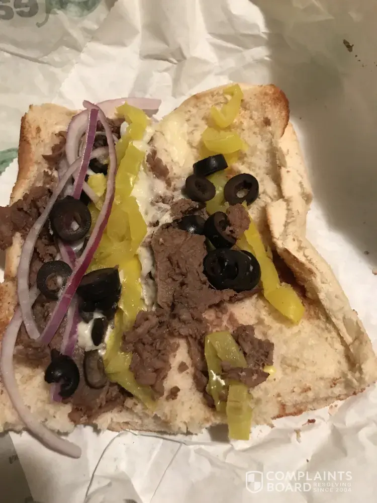 When I sat down to unwrap it I found a sub that was poorly put together with little to no meat. No cheese but mayonnaise that I didn't ask for! Not to mention the dry stringy onions that lay there on the small amount of meat which was very dried out almost to beef jerky ( not quite that dry but you get my point). I took two pics so as I could be taken seriously. I have ordered this same sub at another location and was very pleased. I asked the attendant if another could be made, she said that's how that sub is made, so I didn't get my sub .