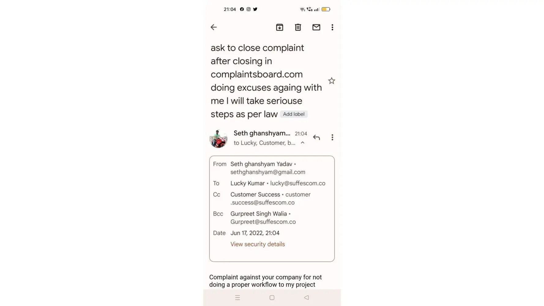 Let not forget that you and your company is doing hide and see things with me i'm about to come with proper legal steps I will take legal action as per law and your office when I visit you are not provided me gurpreet singh walia number why you are hiding since I can understand your company policy is fake on name of suffescom.com once payment received you mile stone of 1st payment you start planning to take immediately 2nd mile stone payment which is not good and not as per company policy norms and terms conditions without doing the first mile stone workflow satisfaction you are making me to worry to do payment of mile 2nd instalment which is not reasonable