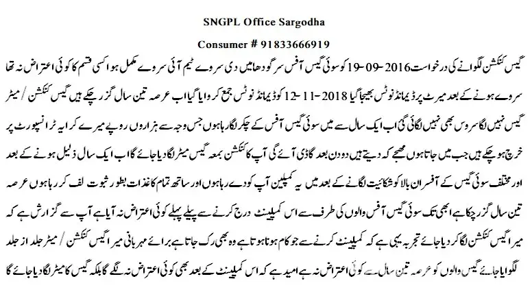 گیس کنکشن لگوانے کی درخواست 2016-09-19 کو سوئی گیس آفس سرگودھا میں دی سروے ٹیم آئی سروے مکمل ہوا کسی قسم کا کوئی اعتراض نہ تھا سروے ہونے کے بعد میرٹ پر ڈیمانڈ نوٹس بھیجا گیا 2018-11-12 کو ڈیمانڈ نوٹس جمع کروایا گیا اب عرصہ تین سال گزر چکے ہیں گیس کنکشن/میٹر گیس نہیں لگا سروس بھی نہیں لگائی گئ اب ایک سال سے میں سوئی گیس آفس کے چکر لگا رہا ہوں جس وجہ سے ہزاروں روپے میرے کرایہ ٹرانسپورٹ پر خرچ ہو چکے ہیں جب میں جاتا ہوں مھجے کہ دیتے ہیں دو دن بعد گاڈی آئے گی آپ کا کنکشن بمعہ گیس میٹر لگا دیا جائے گا اب ایک سال ذلیل ہونے کے بعد اور مختلف سوئی گیس کے آفسران بالا کو شکائیت لگانے کے بعد میں یہ کمپلین آپ کو دے رہا ہوں اور ساتھ تمام کاغذات بطور ثبوت لف کر رہا ہوں عرصہ تین سال گزر چکا ہے ابھی تک سوئی گیس آفس والوں کی طرف سے اس کمپلینٹ درج کرنے سے پیلے پہلے کوئی اعتراض نہ آیا ہےآپ سے گزارش ہے کہ میرا گیس کنکشن لگا کر دیا جائے تجربہ یہی ہے کہ کمپلینٹ کرنے سے جو کام ہونا ہوتا ہے وہ بھی رک جاتا ہے برائے مہربانی میرا گیس کنکشن/میٹرجلد از جلد لگوایاجائے گیس والوں کو عرصہ تین سال سے کوئی اعتراض نہ ہے امید ہے کہ اس کمپلینٹ کے بعد بھی کوئی اعتراض نہ لگے گا بلکہ گیس کا میٹر لگا دیا جائے گا