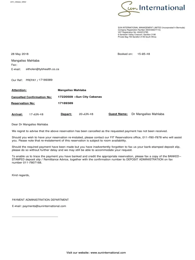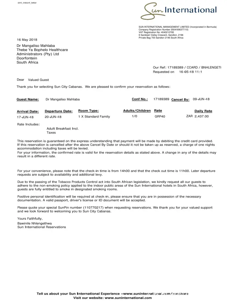 I am very much unhappy about making accommodation with Sun Internationals at Sun City. Last week on the 16th May 2018 I made a booking for our CEO, the booking was confirmed then yesterday they send me an email saying the booking has been cancelled because there was no money on the company credit card but now why was I not told of that the following day and why cancelling the booking knowing very week that he is attending the National BHF Conference next week and he must have accommodation. This morning around 10h00 asking them about this and up to 13h00 there was no reply and at 13h00 I called and spoke to Zakhele and he advised me to send him an email of which I did and he did not respond nor check the email until I called him back at 15h26. He only checked it then and he said it only came now so then alone was strange as to how long does it take for your emails to reach you. I must say I am very much disappointed at this service for such a well known company. One thing let to another ans we are talking about the accommodation for the CEO of Thebe and on of the directors for BHF. Then when I called at 15h10 I was supposed to be put through to Zakhele and waited for more than 5 minutes then someone just handed up on me and then had to call again and waited then Sylvia answered and eventually I got him and it looks like his line was not so clear. but he cave me the new reservation number [protected] and kept me on hole saying he is sending me an email but waited for more than 15 minutes on the phone as she said he wants to check if he can get someone else to send the email for me. Eventually the emails came.