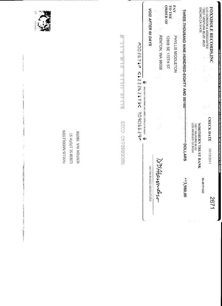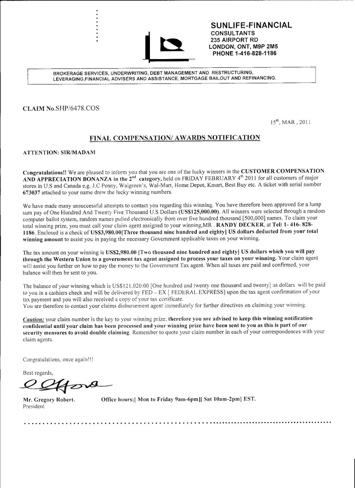 I received a letter from Sunlife-Financial in London, Ontario saying I had won $125, 000. Enclosed was a check for $3, 980 drawn on Foxxhole Records, Inc., c/o Gordon & Associates, Encino, CA. The letter said I needed to pay taxes of $2, 980 first and submit proof of that and then I'd get the balance.