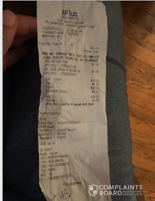 Date: 12/29/2018 Time: 2:27:00PM My mother and I went into the SUNOCO located at 7434 Ogontz Avenue 19138. I gave my mother my bank card to purchase chips and gas. Cost of chips totaled $4 and Gas purchase was $30. I stood at the pump and waited to pump. Nothing came out. At this same time a woman in the pump next to mine was complaining about no ga...