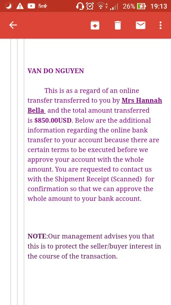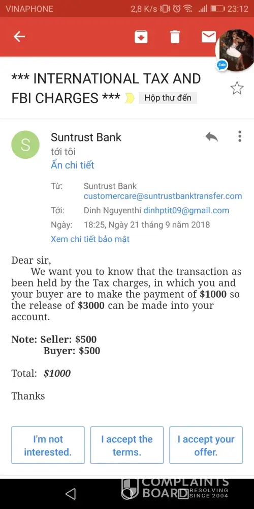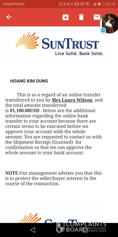 - at 10/09/2018 i received email from suntrust bank by email address : [protected]@suntrustbanktransfer.com