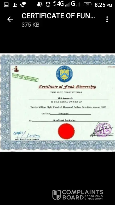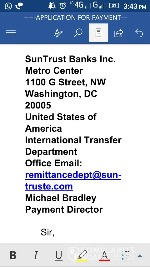 I received emails from your branch Metro centre, 1100 G street, NW Washington DC, 2005 International Transfer Department Tell. +1_206_866_7181 E mail, [protected]@suntruste.com Micheal Bradley Payment Director Sun Trust Mailing that a Fund of Mr's Emily J Craig is transfer to your account. They send copy of certificates now they demands for money to...
