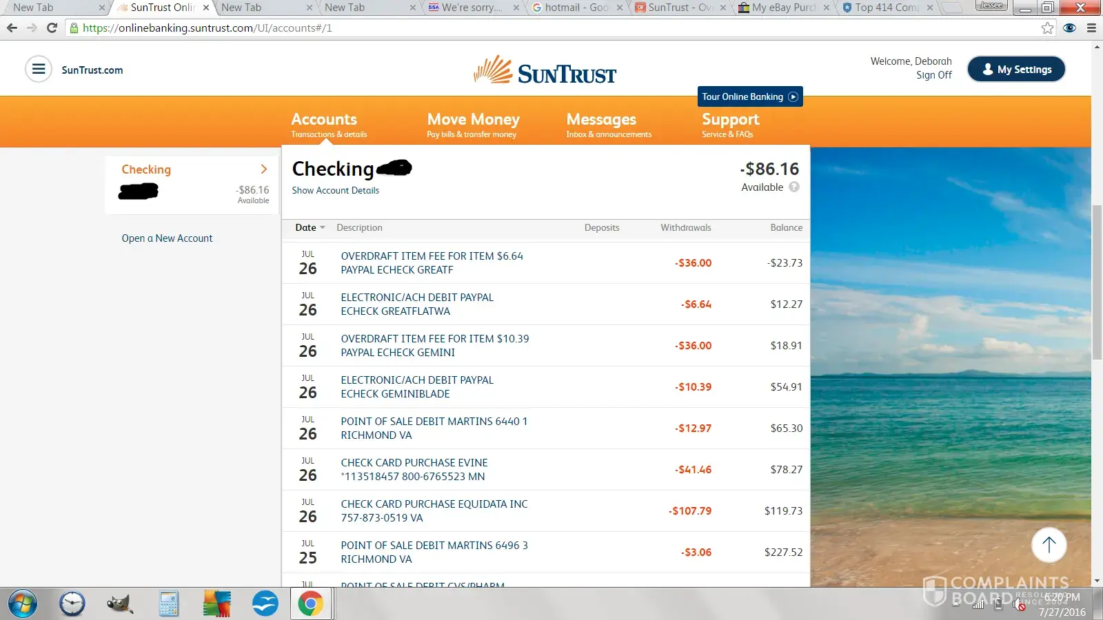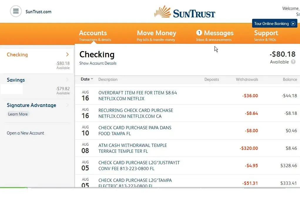 I had sufficient funds to cover all expenses and Suntrust continues to make my account negative by putting Overdraft Fees on my account. I have called the local branch and the 800 number and they try and tell me that these fees were pending. Everytime I purchase anything I immediately look at my online account to see if the purchase amount was deducted and it clearly has been. Suntrust is manipulating my account and when I am in the positive they are charging me overdraft fees and when I call them they are trying to tell me that these fees are still pending. One day I look at my account and clearly charges have been deducted and the next day I am in the negative.