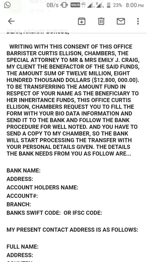 Mailing that a Fund of Mr's Emily J Craig is transfer to your account.
