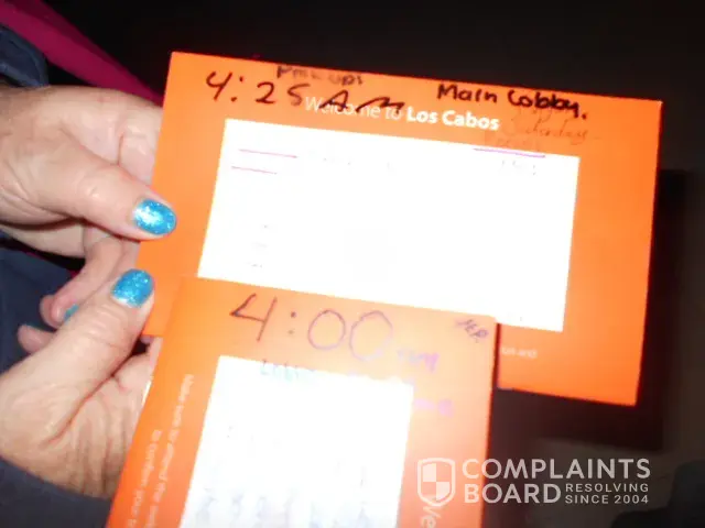 them why they were late. We were told that the pick up time was 4:25 am. I took a picture of another Guests booklet and ours too for proof. Okay so your Sunwing representatives sure got the last laugh and taught us a lesson for messing with them.
