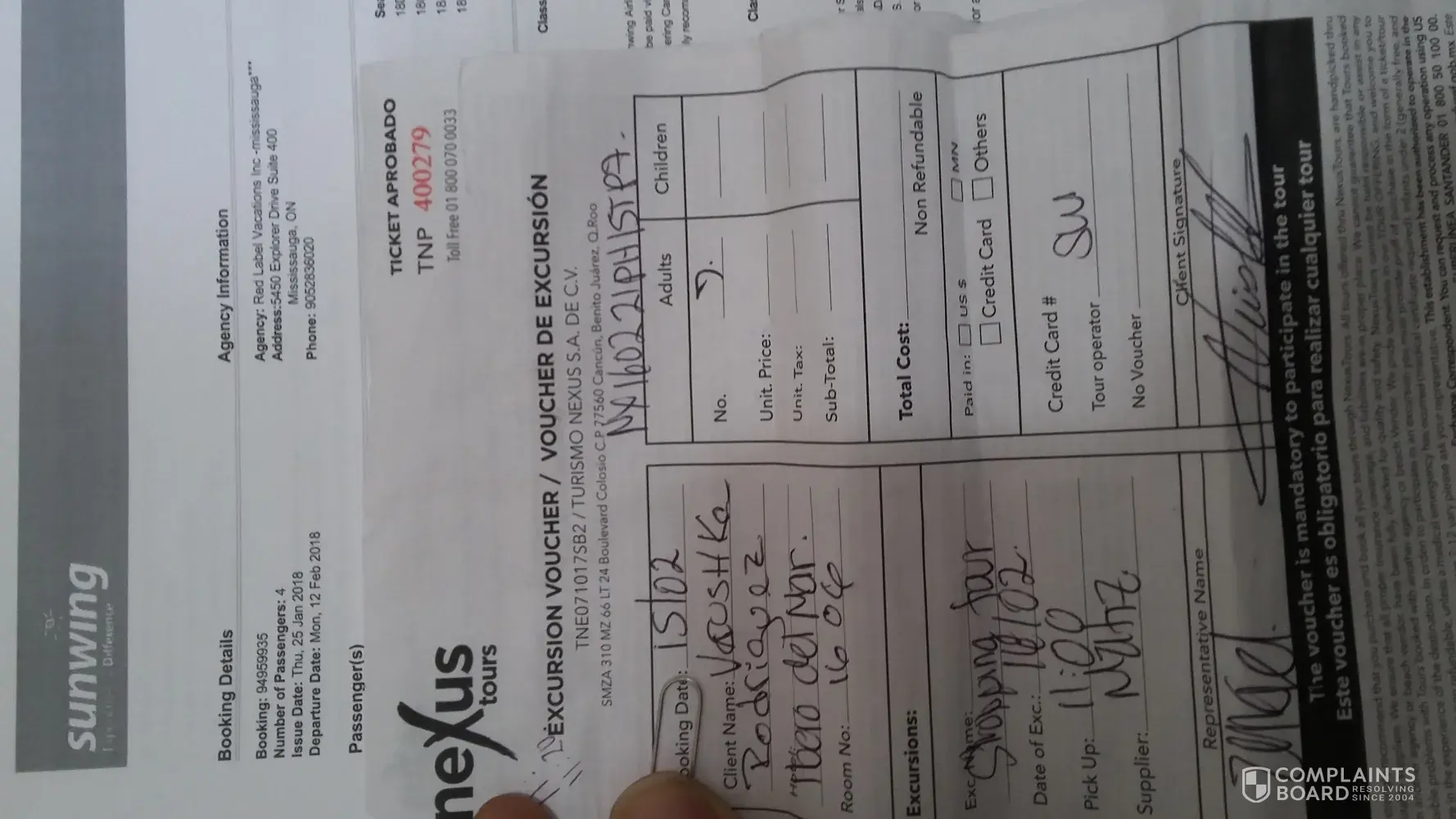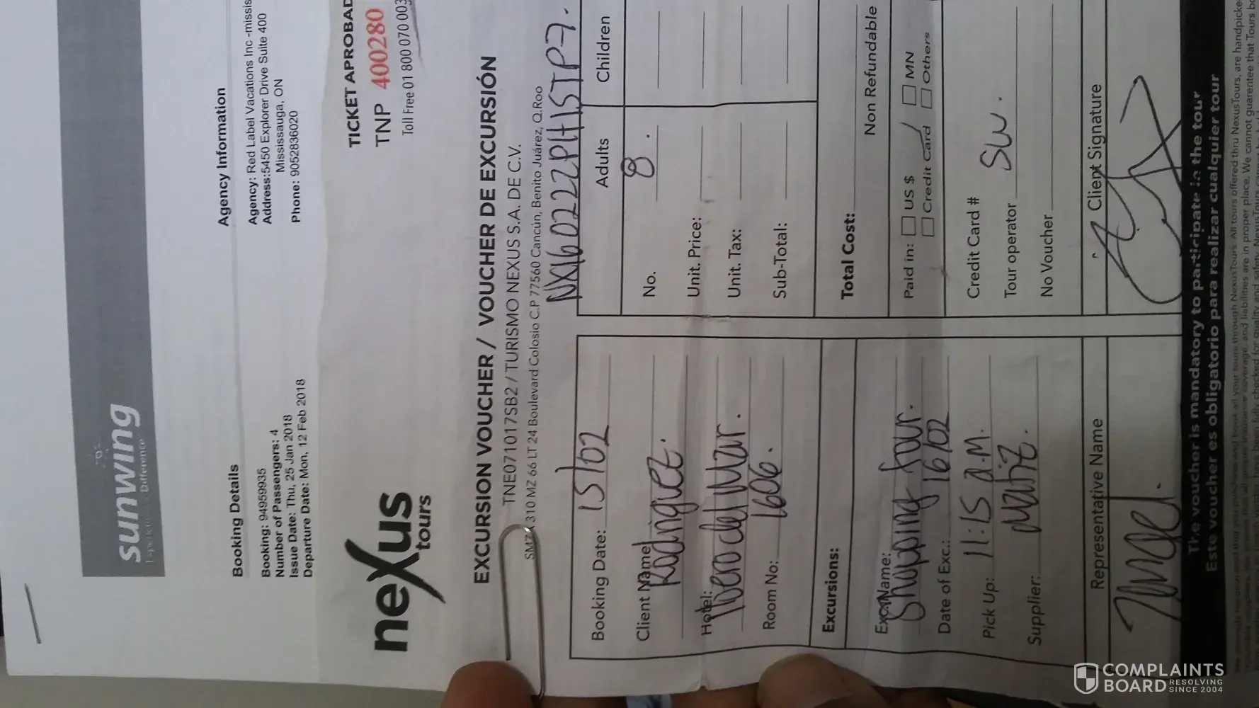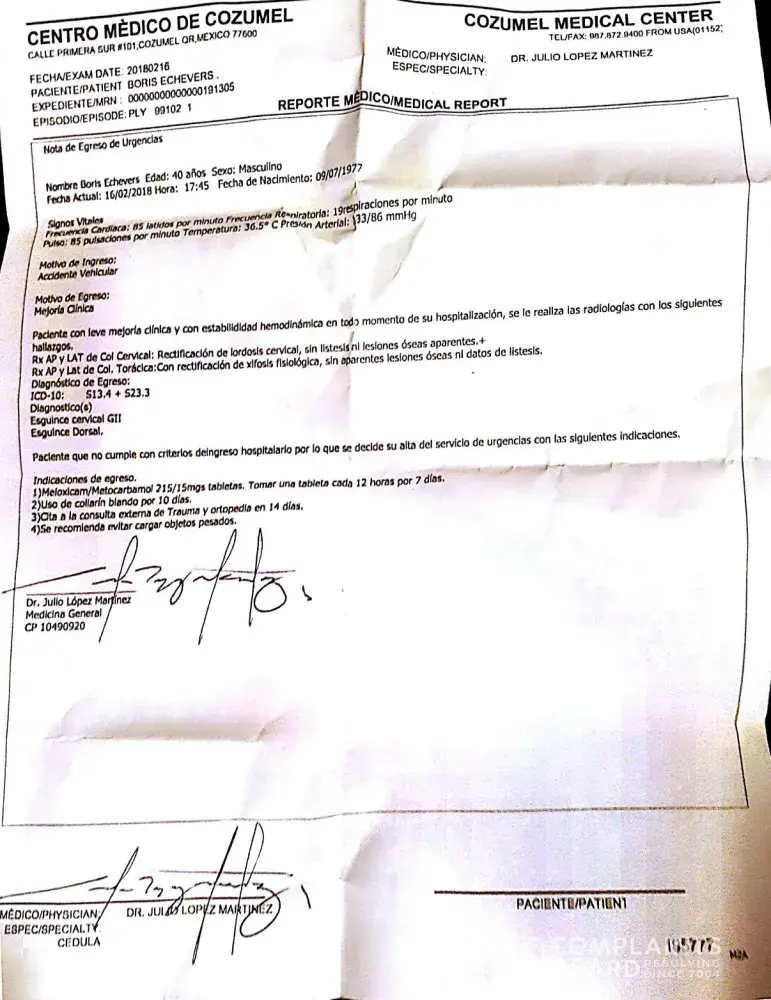 Last Friday February 16, 2018 the all group family were send to the shopping tour from the Iberostar paraiso del Mar with one of your NEXUS transport, and our vans tour was severe stroke by behind on the highway 307 and all passengers were transported to the COSTAMED hospital. After all medical test done we were not allowing to leave the hospital because the insurances tours cars involved did not agree with the accident the responsibilities and the hospital staff suggested us to pay in front to later get reimburse by the insurances. We have 3 infants between 1 to 3-year-old with no food or baby supplements because everything was in the resort, we keep asking for the police report or medical report to at least call our insurance company in Canada bot no one help us not either the Sunwing resort front desk, or the represent from the resort. Around 8pm We decided to leave the hospital and surprise outside was the insurance agent from GNP (seguro de auto GNP.com) Waiting just to see if we paid, after they just laugh of US and left. Them an argument with the hospital staff start. All day was lost and every one on pain and no one knowing nothing to help Us. We call the Canadian Consulate and they just toll us to consult with the Sunwing agent for help. We just request to get our reports to proceed with the medical treatments' back home, and a refund. Half of Our vacation missed and here now in Canada with no medical or police accident report, thanks God we're alive. More pictures of the accident and hospital on request. Below all the your tour transport passengers. Hope to know soon from you. Thanks.