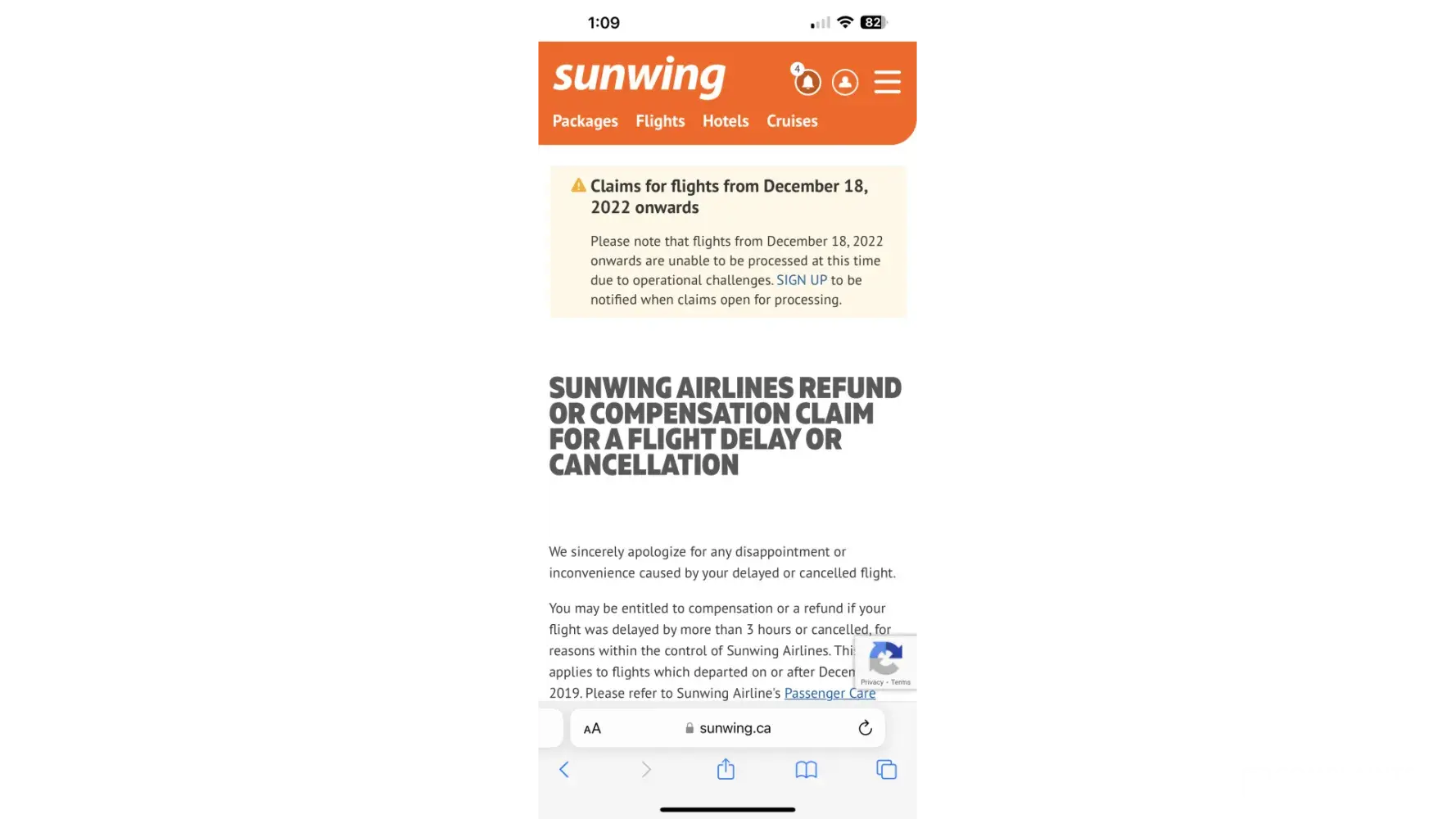 Sunwing is declining claim for flight delay .