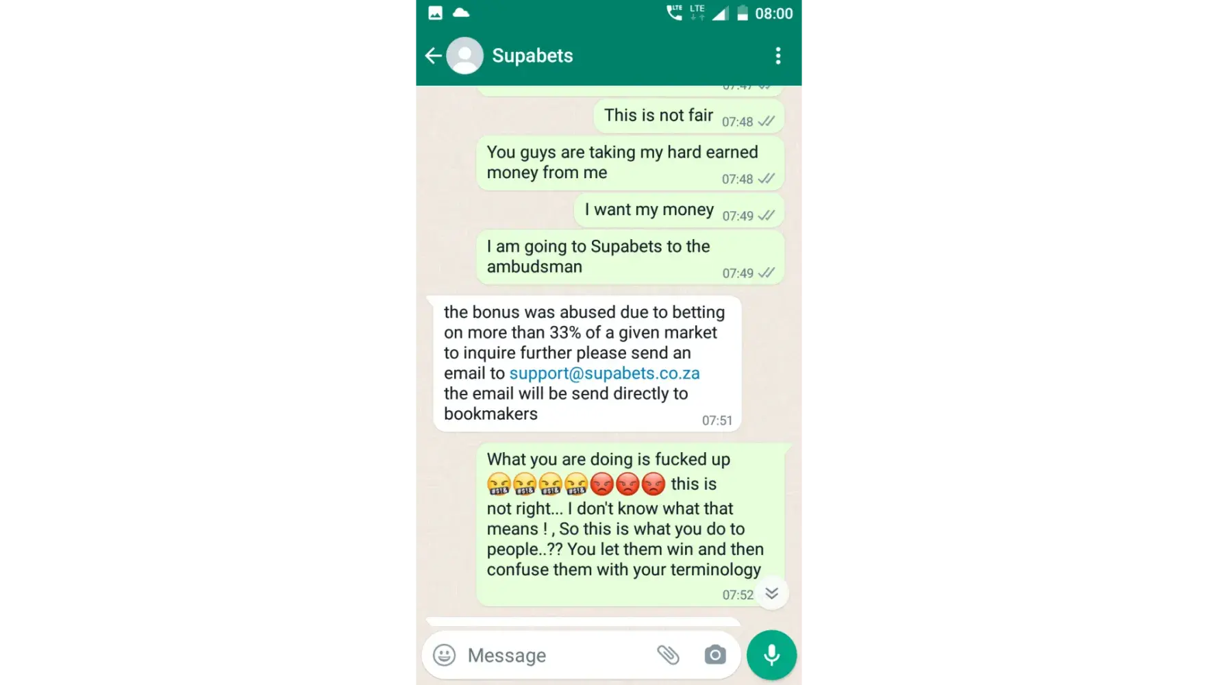I have been scammed by Supabets betting, I withdrew an amount of R300 from my account which I won fair and reasonable... And now when I am supposed to get my money I am told that I abused the deposit bonus that Supabets gives out to it's new clients I deposited my hard earned into the account and received a deposit bonus... And then won from my deposit. And now when I'm supposed to receive my money/payment they come up with stories and absurd reasons not to pay. I am upset and very heart broken with Supabets... What they did to me is wrong and unfair.