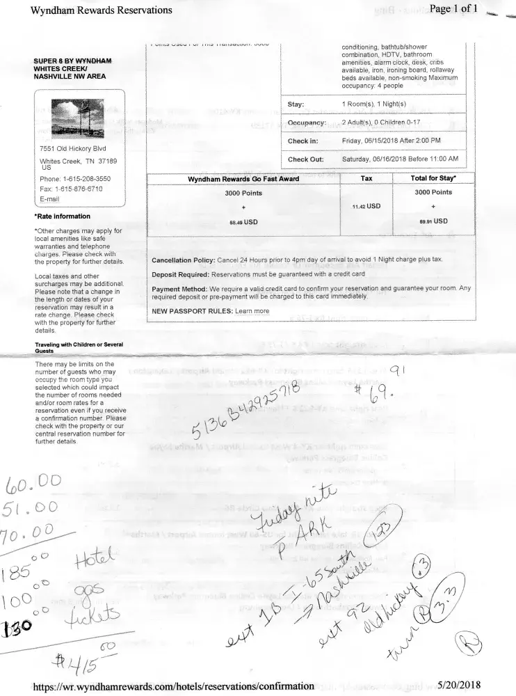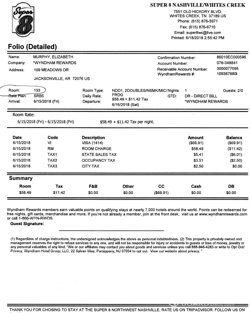 hotel stay 6/9-6/10/2018 super 8 breaux bridge, la 70517