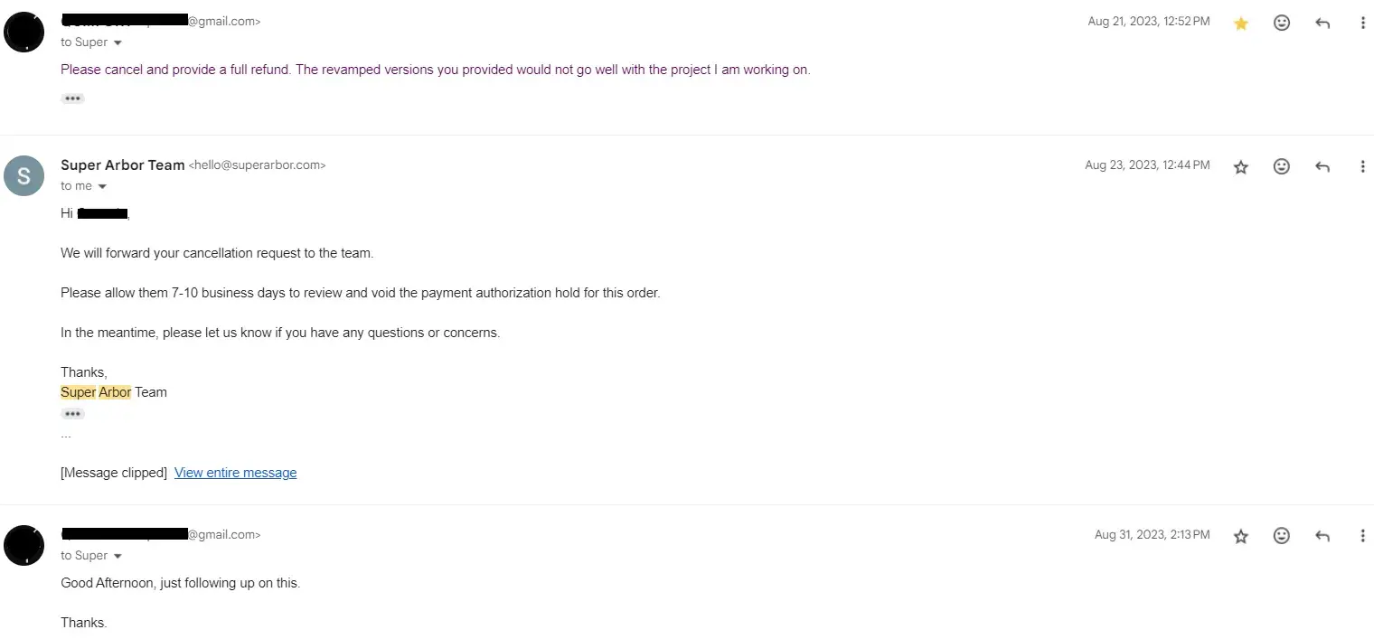 Another complain for super Arbor , after we agreed to cancel the order, they said that we were not going to charge you and to please remove the review that you put in. I tried to pull my review but didn’t get removed, and I have proved that I accomplished the request to remove the previous review. Then suddenly, I found that they charged me for something I had canceled already after waiting a month from 09-08-2023. I canceled it after the review date I put on 10-11-2023, so they contacted me to remove it and cancel the order. Now, they charged me on 10-16-2023 because the review didn’t remove. I called them, and he said I couldn’t do anything until you removed the review. What [censored]ty company shouldn’t be in the market serving hard-working people?