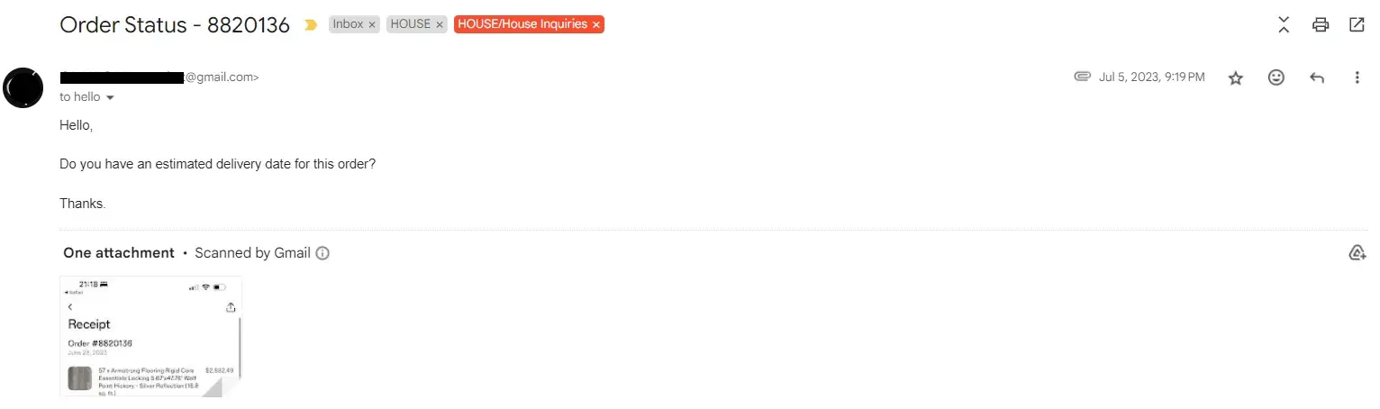 I'm reaching out to let you know that we're experiencing a higher-than-usual demand for flooring, and unfortunately, your order has been impacted by the delay.