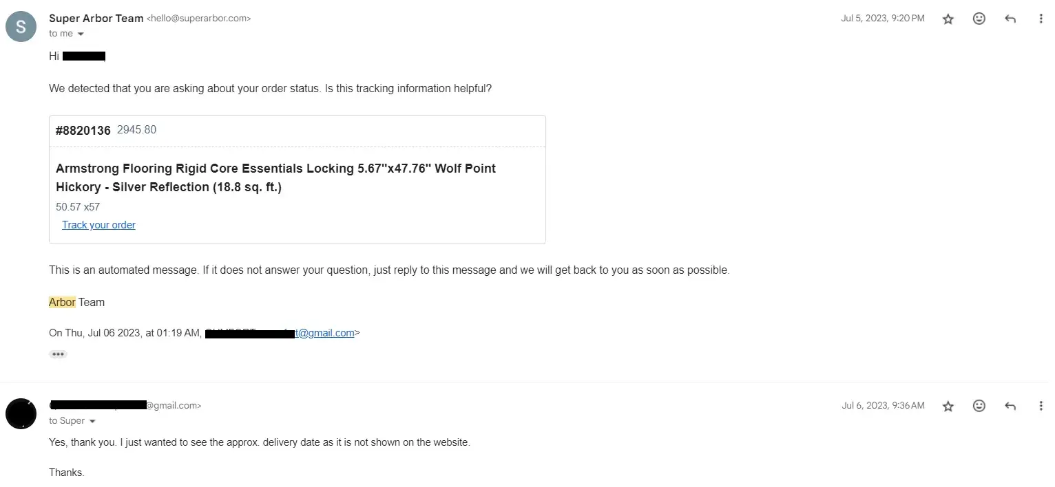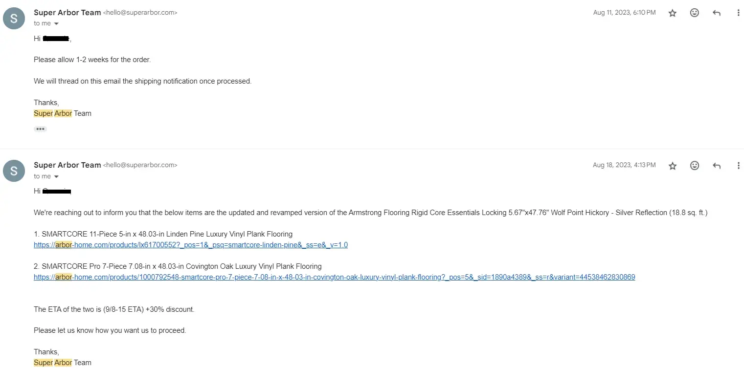 Order placed may 29, 2022 for flooring products. Order #11087. Product never delivered. Payment charged immediately. Emailed back and forth 3+ dozen times and always get same automated response refund team is working on refund. Disputed the charge on my credit card. Super Arbor responded cancellation of membership not completed in timely manner. This order was not for any sort of membership. Do not trust what they say or post on their website about not being charged until order is fulfilled.