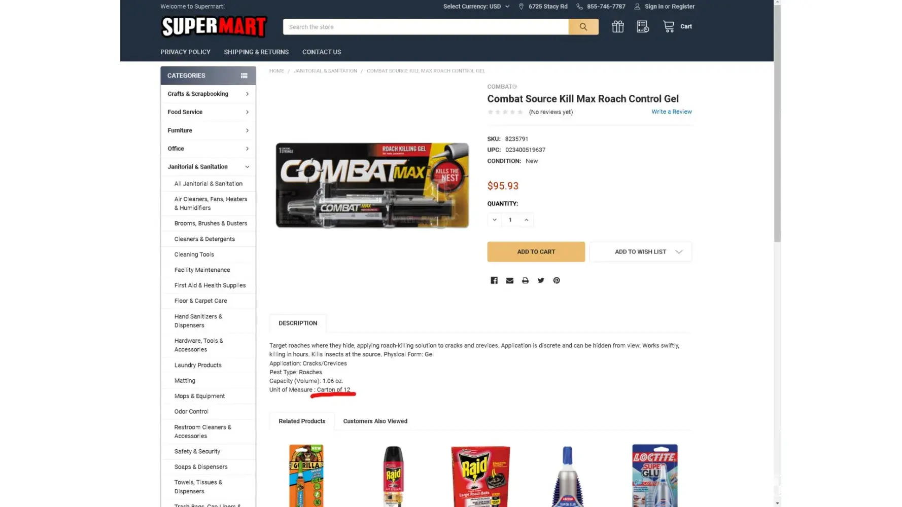 Company website has Combat Roach Gel listed at a price of $95.93. This same gel is $9.97 at Home Depot. I looked at the description and the Unit of Measure says Carton of 12, so I believed I was ordering one carton of 12. What kind of idiot buys a single $10 product for 10x it's normal going price? I guess that'd be me because even with a screenshot of the misleading listing, Discover card initially sided with this scamming company until I persisted in reaching a supervisor. Supposedly this site has some affiliation with Google. Shame on Google and screw "Keith" at Supermart. Places like this should be fined and taken down.