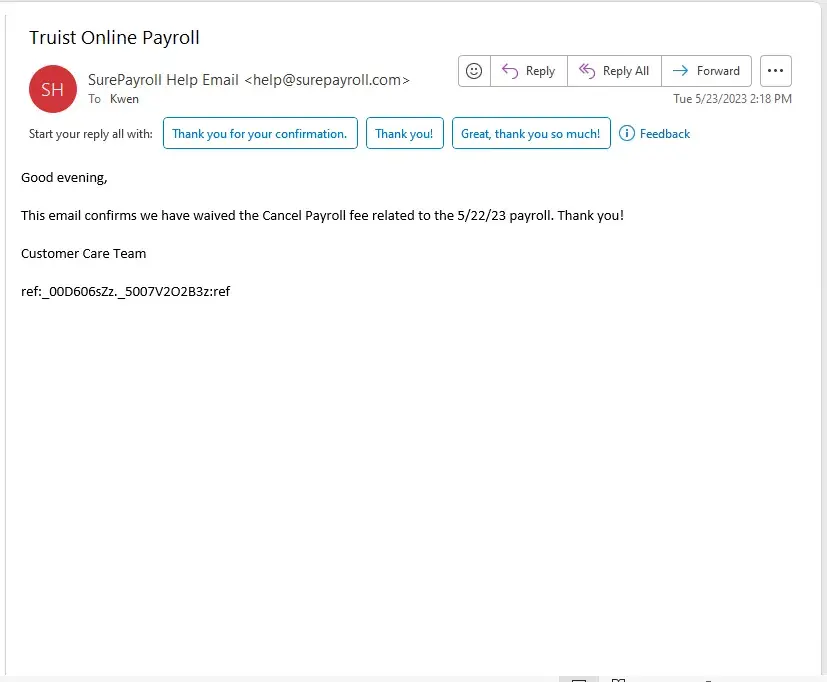 I am totally new to payroll, my payroll was set up through Truist Bank and this is who they contract with. A representative of Surepay scheduled a time with me in order to assist me with setting up my payroll account. Being this was my first time setting it up I can admit it did take some time trying to navigate the system. While the rep was on the phone assisting me, while we were in the process, she tells me that she has a meeting scheduled as has to let me go. Now we may have been on the phone about 10-15 mins, why would you schedule my call if you only had 15 mins available, I have no clue. So I made a mistake and I emailed her and told her I needed her assistance as soon as possible. She informed me she wouldn't be available the rest of the day. Then I stated I will need to speak with her on Monday, she stated she wouldn't be available. I contacted another representative who was assisting me and she did for awhile, until we had to wait for someone hire to approve an action she was trying to make. She provided me with her email and told me she would call when it had been approved. Two days had went by when I reached out to her, still nothing. I took it upon myself to cancel the payroll because I didn't want my account to be overdrawn then I get a charge of $80 for cancelling payroll! When I found out the reason for the charge, I contacted Surepayroll and was told there are no managers available to take customers call and the rep was very rude, cutting me off, would not supply me with his identification ID. He informed me I had one time to waive the charge, which I don't feel like I should have to use my ONE time because their training was not up to par and I made a mistake, then when trying to fix the mistake their staff would not assist me, therefore leading me to cancel it and now acquire a fee.