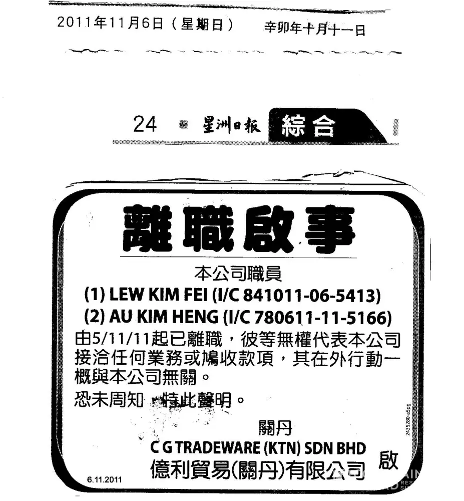 This is the abstract from SIn Chew Jit Poh Page 24 date: 6-Nov-2011 MR LEW KIM FEI (I/C [protected]) AND MISS AU KIM HENG (I/C [protected]) FROM 5-NOV-2011 has been terminated from the company. Thus both of them cannot represent our company to deal with our bank, customers and suppliers, sign any document and cheques and receive payments. All their...
