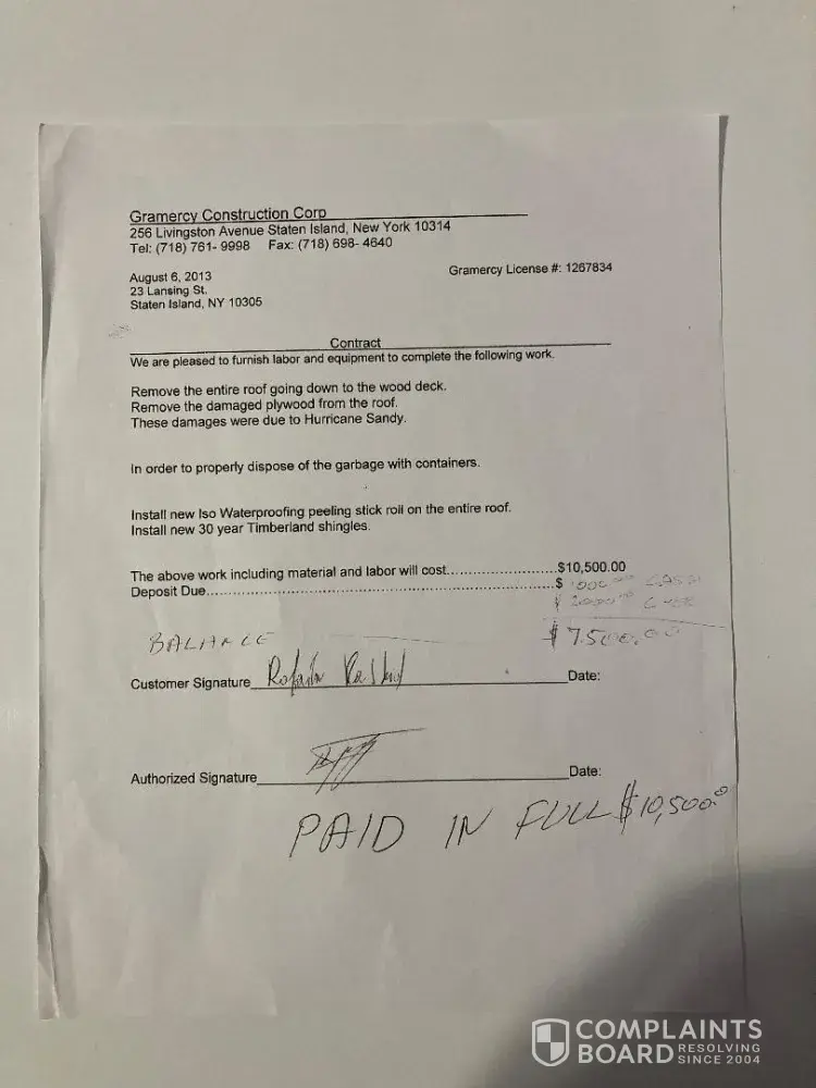 Read full complaintGramercy Construction Corp - Roof repair
