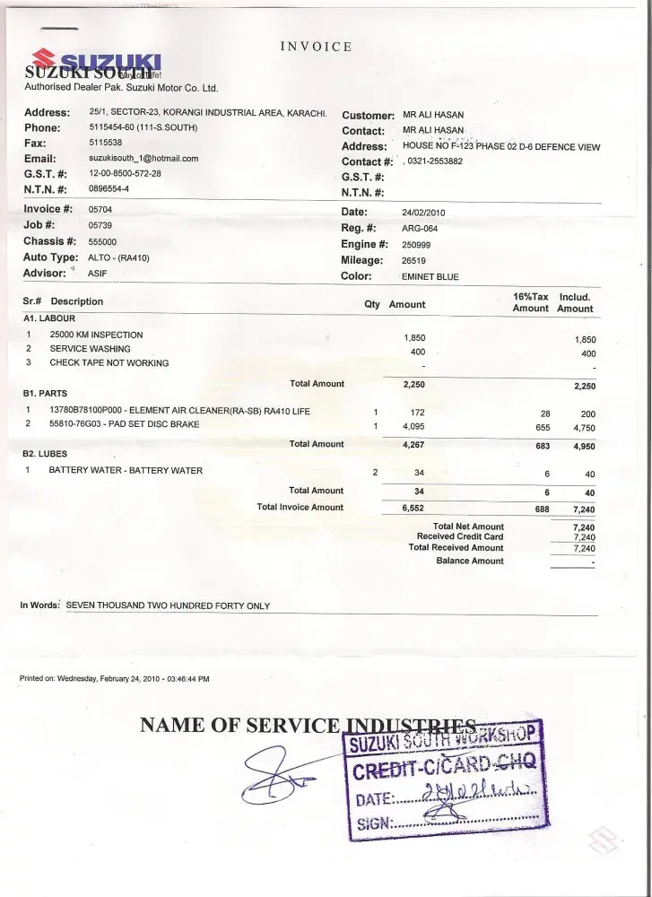 I handed over my car to Suzuki South workshop which are authorized dealers of Pak. Suzuki Motor Co. Ltd. The address of Suzuki South is 25/1, Sector - 23, Korangi Industrial area, Karachi. I handed over my car in the morning of 24th Feb., 2010 for 25, 000 Kms Inspection. I specifically mentioned not to change the engine oil and oil filter. When I went to collect my car back, the bill showed charges for engine oil and oil filter change. When they asked the concern advisor to explain this oil change, he repiled that " the oil condition was so bad that they have to change the engine oil".