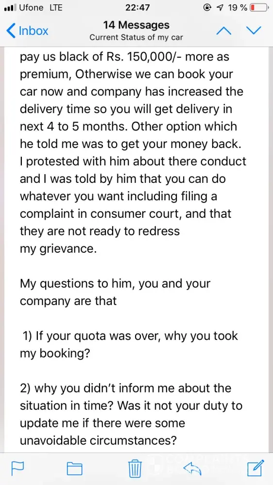 I was shocked to hear his reply that our quota was over so we have not yet booked your car. He further added that in case you need a car urgently you need to pay us black of Rs. 150, 000/- more as premium, Otherwise we can book your car now and company has increased the delivery time so you will get delivery in next 4 to 5 months. Other option which he told me was to get your money back.