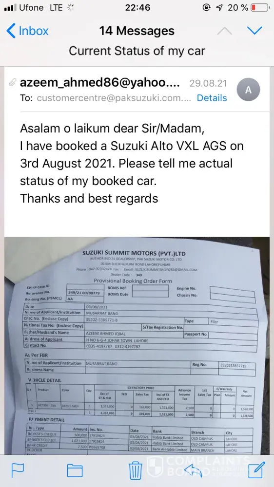 In continuation to my previous emails, it is again submitted that I booked a Suzuki Alto VXL AGS at Suzuki Summit Motor, Javed Nagar near Kot Abdul Malik, Lahore Sheikhupura Road Lahore Pakistan on 3rd August 2021 by paying full payment in advance of Rs 1528500/- with a commitment to get delivery of a car in 45-60 days.