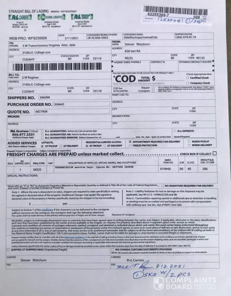 Received Incorrect transmission on 3/8/21. Contacted SW Transmission and was connected to Sancho in Customer Service, (Sancho Customer service [protected] EXT. 2188, [protected]@autopartsemail.biz). Sancho Informed me that SW transmission shipped the incorrect item. I was sent a Return Pick thru R/L Carriers and on 3/12/21 that items was returned to SW Transmission WEB PRO #WF9235926.