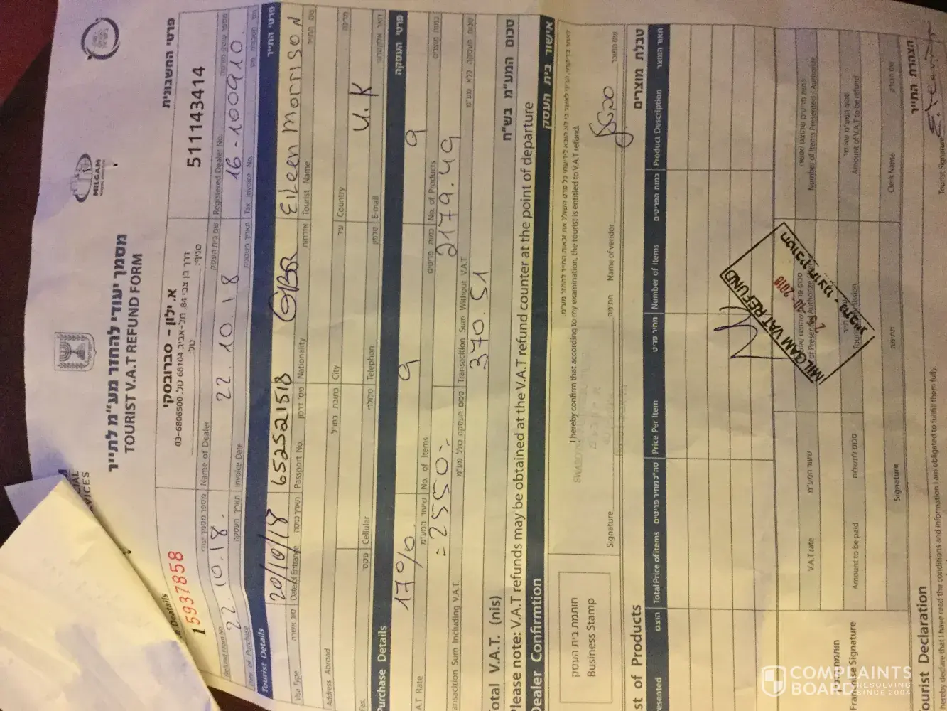 On holiday in Tel Avive we visited your shop in and purchased some of your jewellery and we were told that the VAT would be refunded at the air port, but we had to go to another of your shops to get the correct forms. The cost to get to the other shop was £20 return. But the refund was going to be around £90 so we decided to go and get the forms as directed by your staff. When we got to Tel Avive airport to return to the UK we presented the receipts and the VAT forms to the VAT office where we were told that they were illegal and not acceptable for refund.