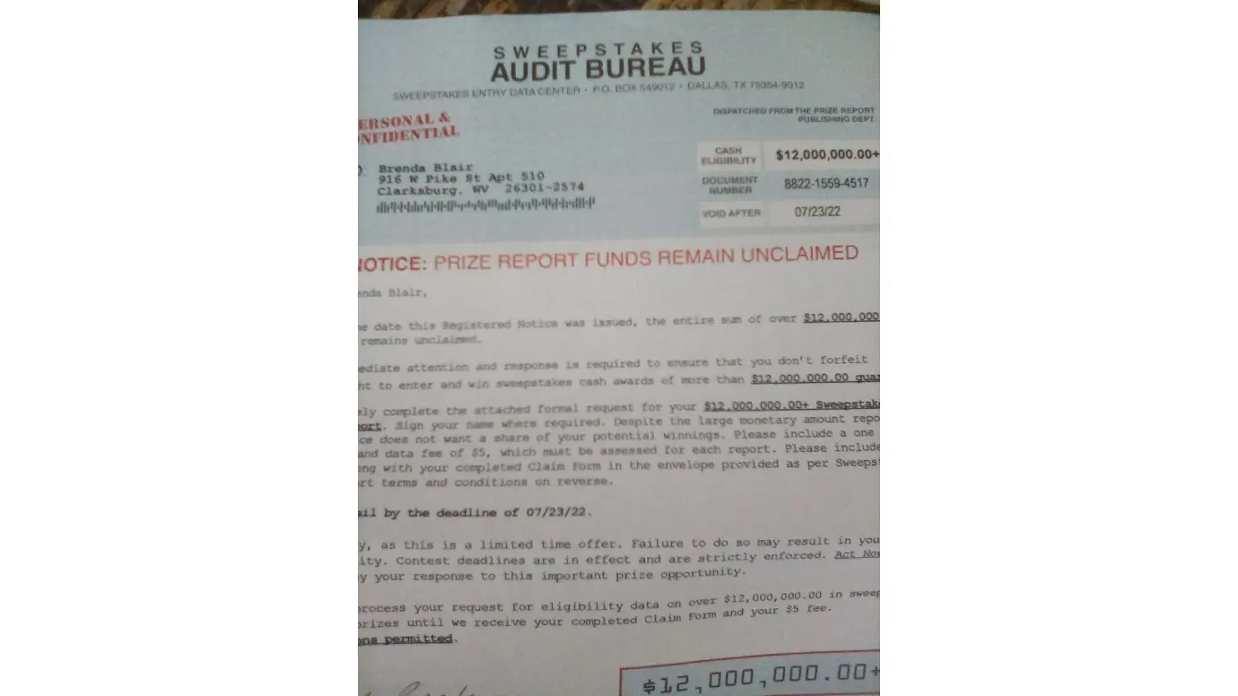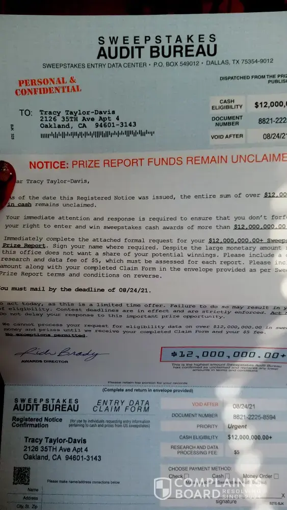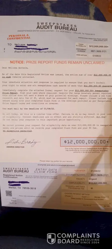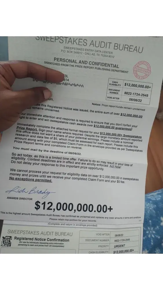 The Company is asking me to pay $5 to process my winnings of $12,000,000.00+ guaranteed. At the top of the letter addressed to me looks like a check written to me and in that area it states Personal and confidential. The letter from the awards Director Rich Brady, Sweepstakes Entry Data Center, P.O. Box 54912, Dallas, TX 75354. NOTICE: prize report funds remain unclaimed, Document # [protected]. Void After 3/19/22. Priority: Urgent. On the back of the letter it has Sweepstakes prize report terms and conditions.