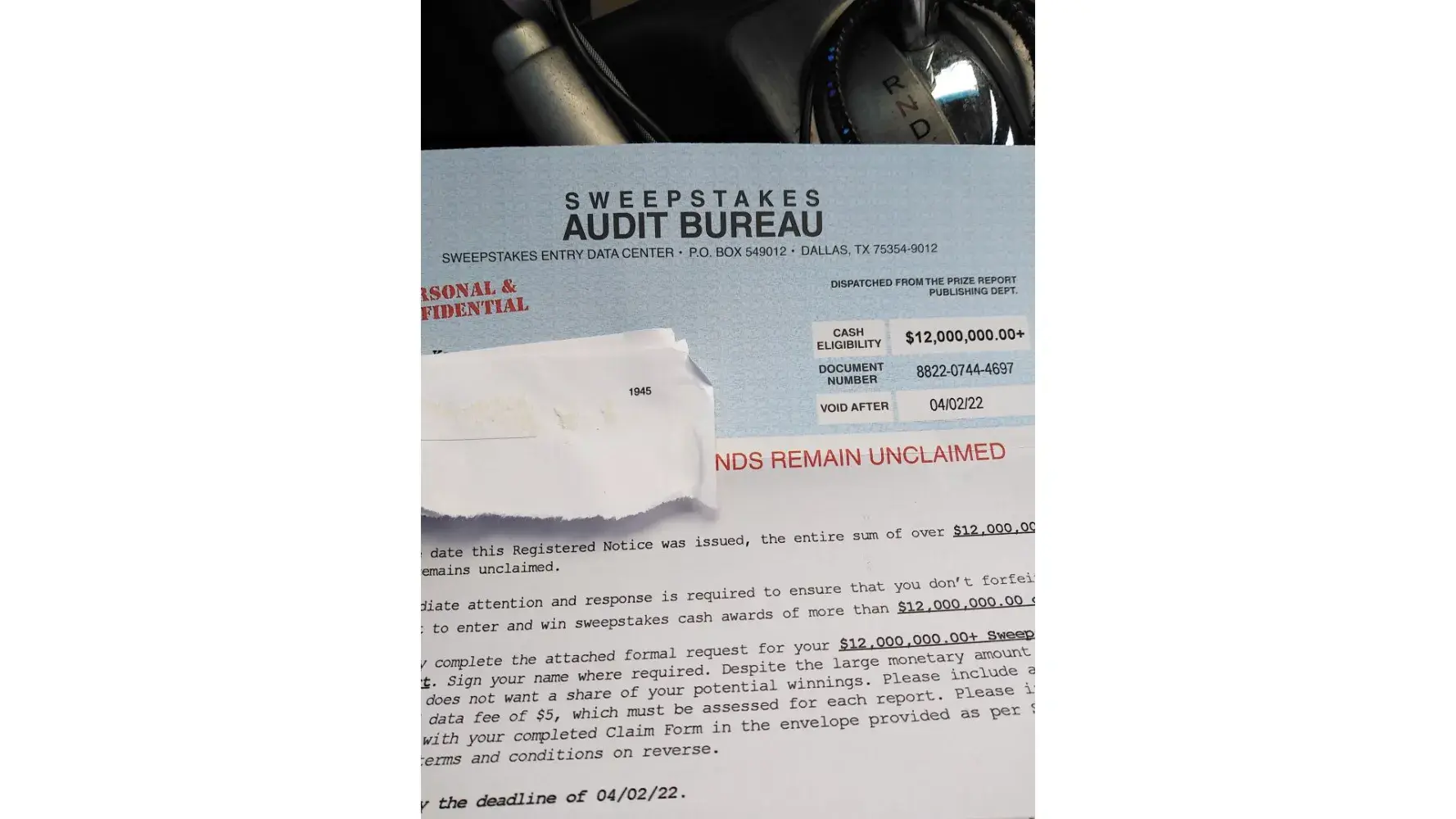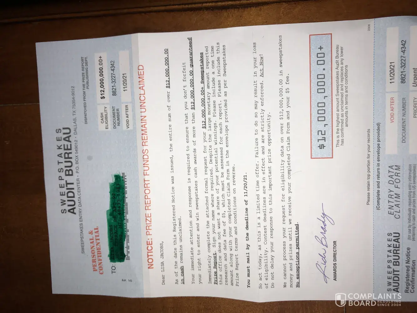 I just received the "exact" same letter.. The Sweepstakes Audit Bureau " in Dallas Texas. They apparently aren't very worried by any wrong they are doing cause my letter reads identical to the ones I see here. I decided to research this company before getting my hopes up. I see I was right. The only thing different on my letter is the document number [protected] VOID after date 04/02/22. Everything else is the same signed by Rich Brady. I suppose he isn't real.