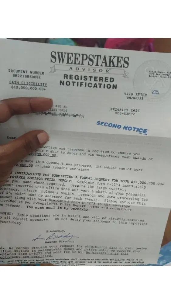Well I was supposed to receive my $10,000 on July 7th 2022 never received anything at ALL!? I can't believe they are allowing this to come to ppl Mailbox every month SMFH 🙄😒🤬! Not only that they had a nerve to send me a second notice saying they didn't receive the first one was the $5 fee. So then they sent a second letter about August 6th that there was another drawing for the $12,000, 000,00 the deadline to mail it in is August 6th 2022! What happened to the July 7th winning number so it just doesn't make any sense that they keep sending this out to different people's new address even when you move they'll still find out but you live and they'll still send it claim you've won money and it's a big fat lie!