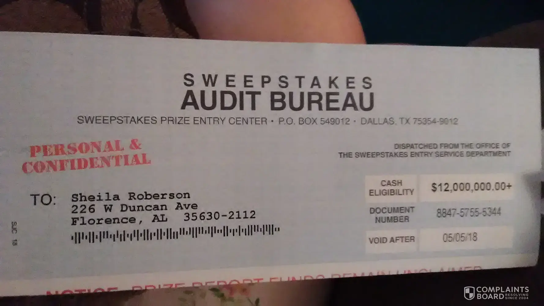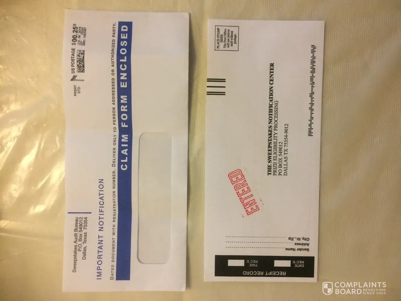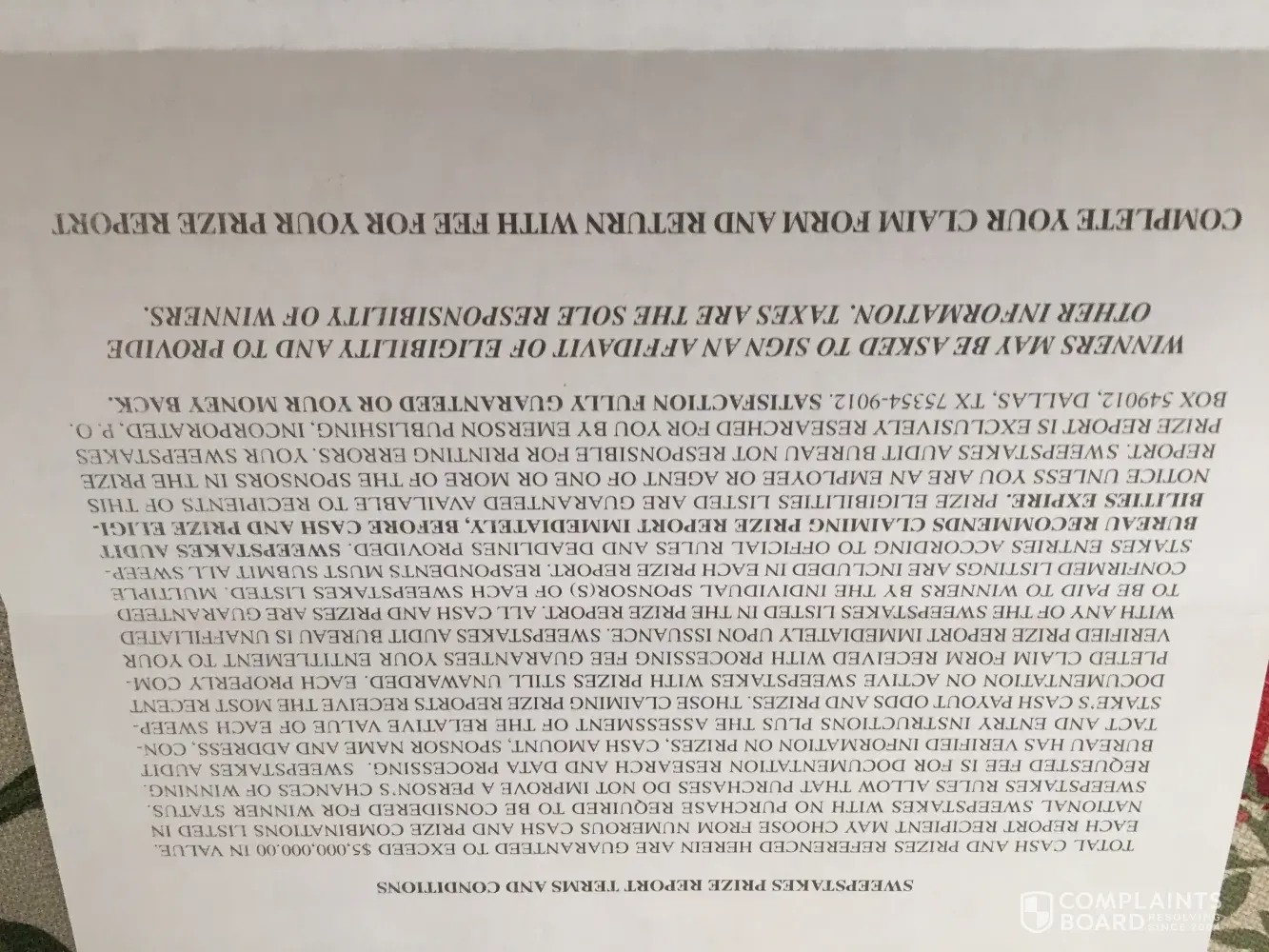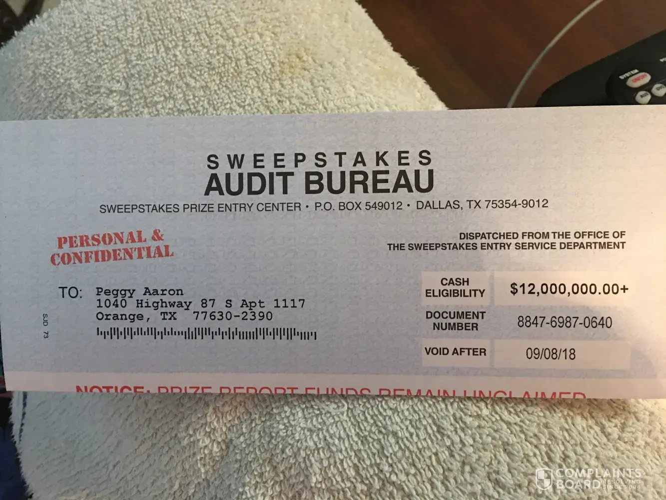 Sweepstakes Audit Bureau addressPO Box 549012, Dallas, Texas, 75354-9012, United States