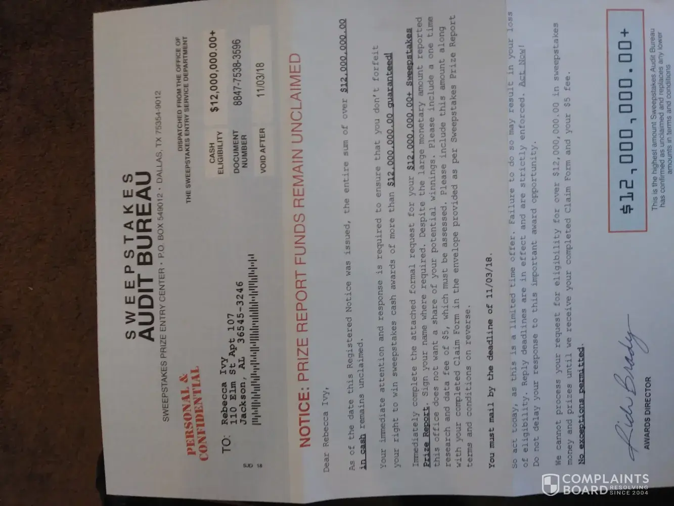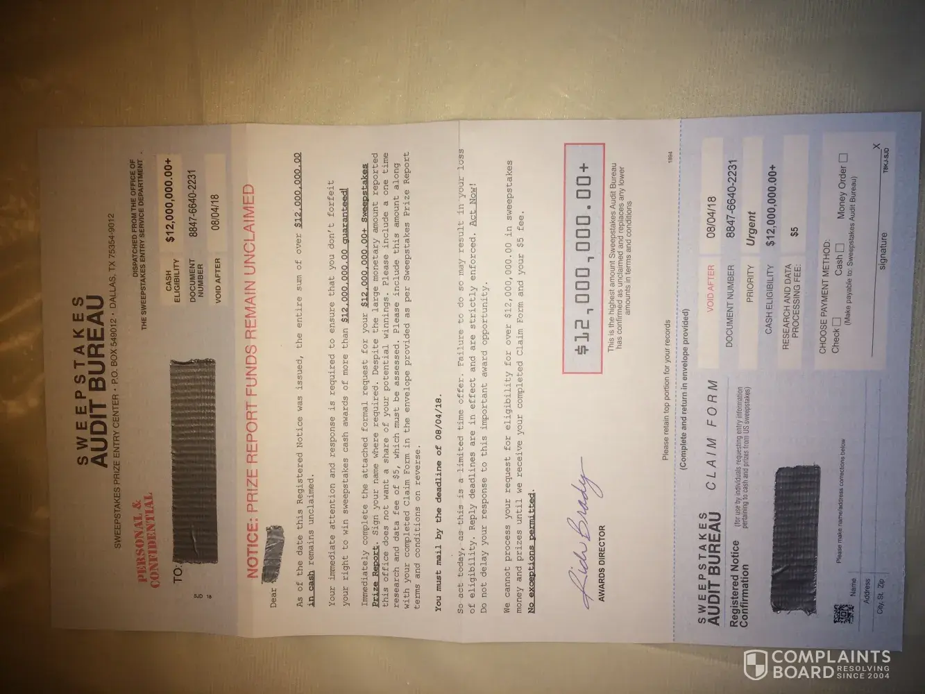 In the last year, I have received several letters from a rich, L., And other names, but all with the last name of Brady.. Each of these letters say I'm eligible to claim 12, 000, 000.00 if I send $5 for processing fees. The claim number assigned is document # [protected] due by 5/27/2017. They claim they don't want to take anything away from your rewards, but need a processing fee cover the costs of making you edible for this, or larger amounts outlined in their policy, and strict edibility response dates. Would love for this company located p.o. box 549012, Dallas, TX 75354. Please ignore any request via email, and via mail from this company, because it's a scam.