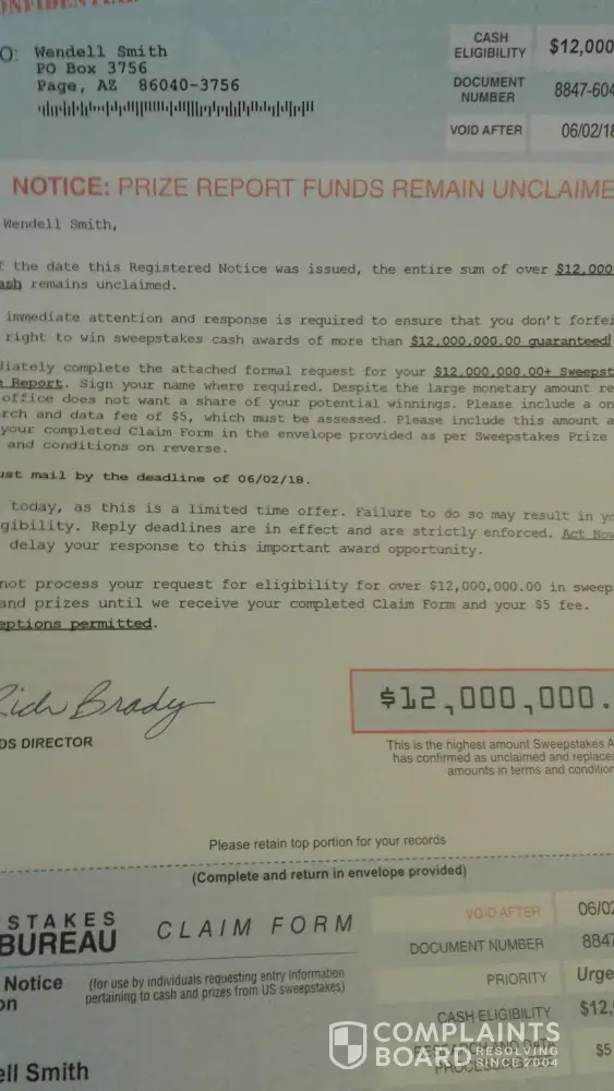 have received many of these so called sweepstakes advisory notifications claiming there is 12, 000, 000.00 dollars of unclaimed prize money and to send $5.00 or i'll forfeit my rights to win this sweepstakes cash award . These people flood your mail boxes with this "SCAM" at least 2 or 3 times a week and someone must stop these people. To me it is a form of...