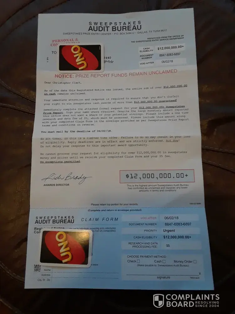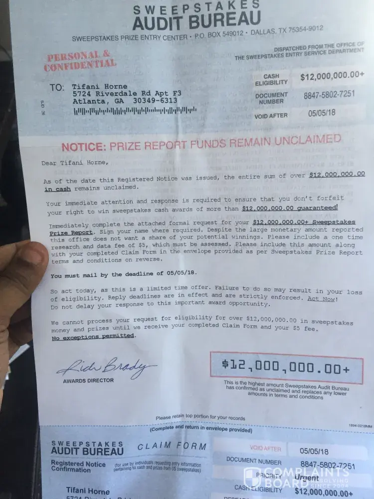 They (Sweepstakes Audit Bureau) sent me a letter from Dallas Texas saying I could possibly win $12, 000, 000 but have to send a $5 fee. I never heard of this company and don't know how they have my address. I looked this company up to see if they're official or not to which I seen nothing but it bringing me to this sight full of complaints.