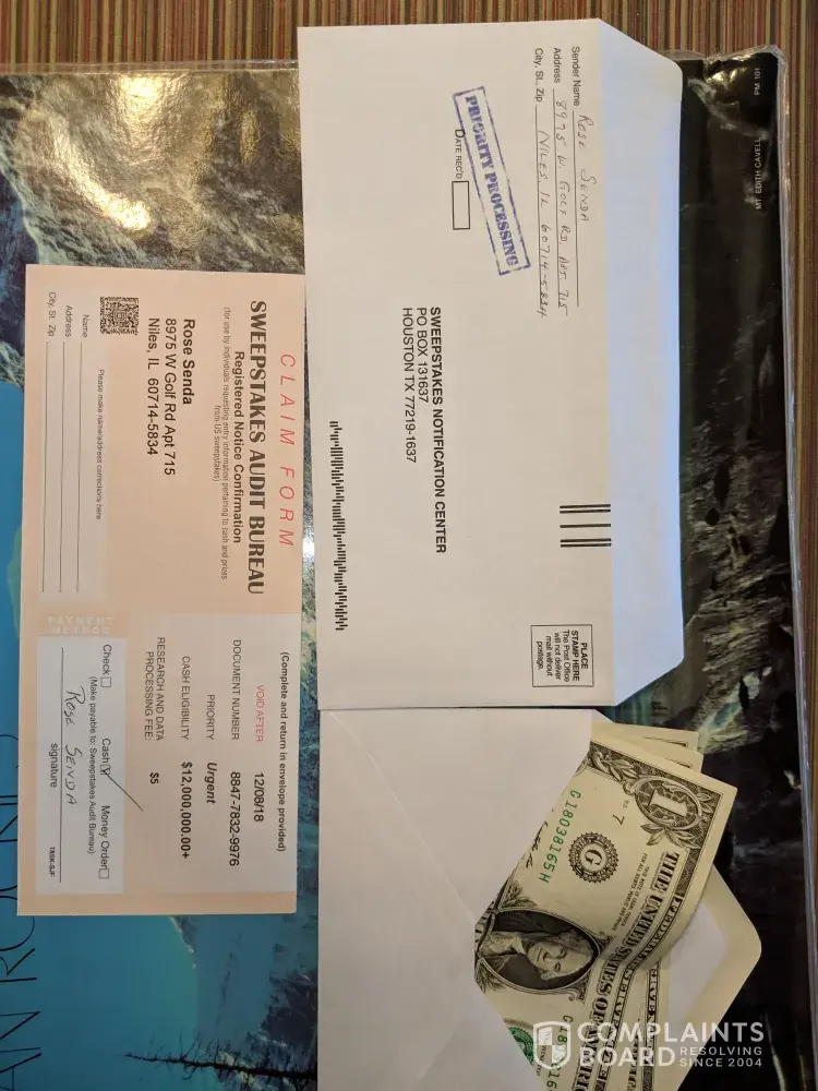 I ALSO RECD second NOTICE REQ ANOTHER $5.00 THEN CAME TO THIS PAGE. they don't check to they sent too already. NOT GOING TO MAKE SAME MISTAKE twice, WISH i HAD Recd second Notification from Sweepstakes Audit Bureau with Mail In Address of PO Box 549012 Dallas Texas 75354.RINTER ATTACHED TO THIS CPU i would print and send too. Did send ltr to BBB,