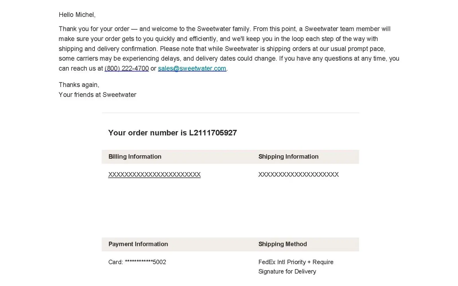 However, on the 28th, the day after placing my order, I received an email from a sales engineer named Gregg. I reached out to him via email but did not receive a reply. I decided to call Sweetwater today, assuming that they would have everything under control. Unfortunately, the customer representative informed me that my order had not been shipped or packed yet.