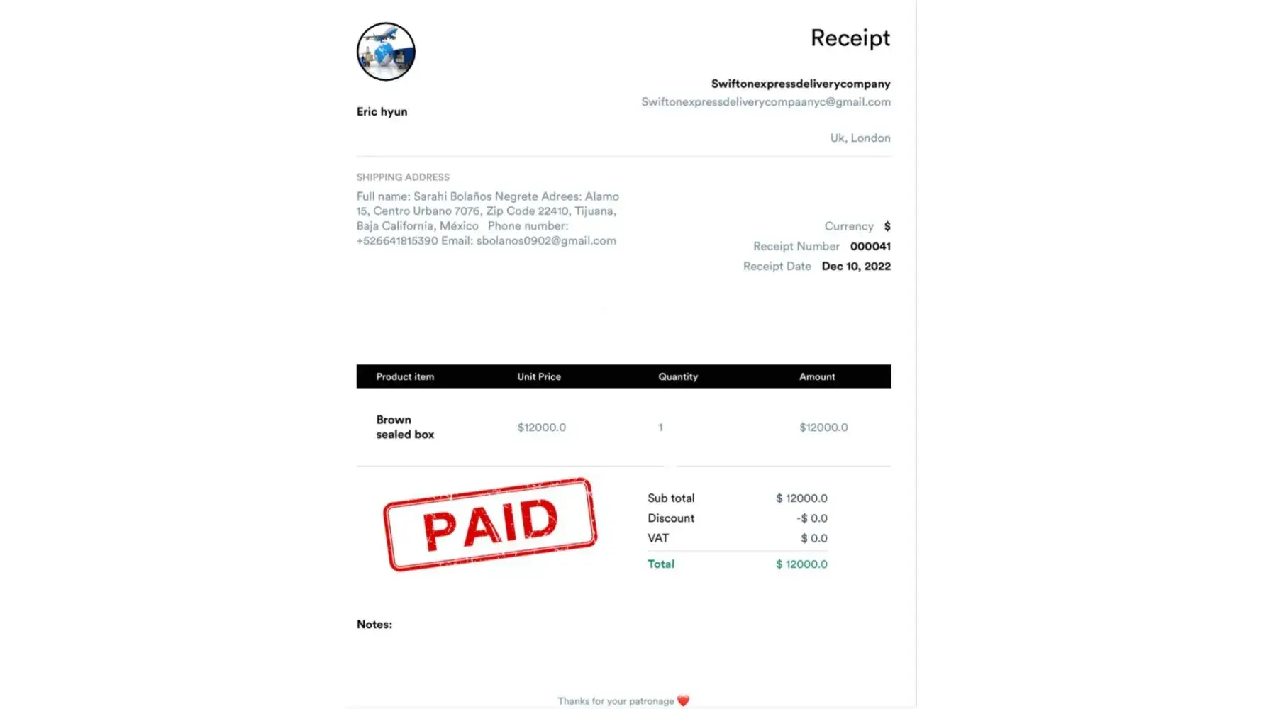 5 days ago I contacted Eric Hyun, we talked, he asked me for my WhatsApp and I gave it to him, we continued talking and he confessed to me "his love", that he wanted to meet me even getting married too, he told me that he sent me a package with gifts and money inside and that he only had to pay the taxes of my country, he only sent me a I told Eric that I had not received any mail, I asked him for the tracking number of the package and he said that he had forgotten to ask for it, that I had received the mail from the parcel but that I did not believe him and that I did not want the items. He got angry according to him. I feel terrible at one point to believe in fantasy stories.